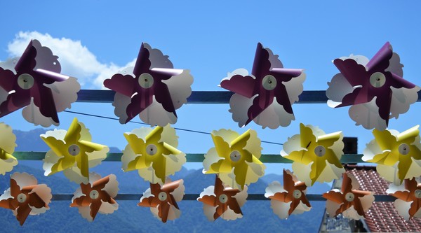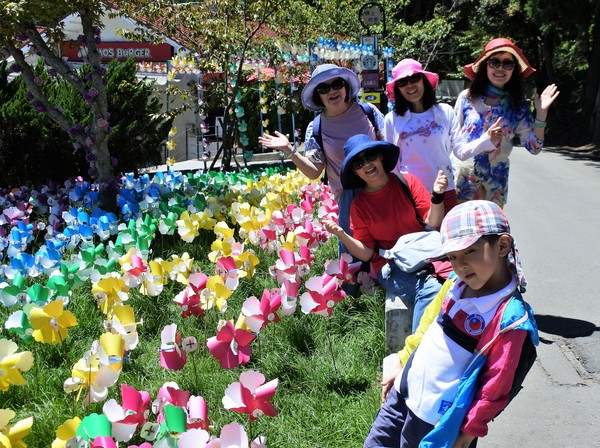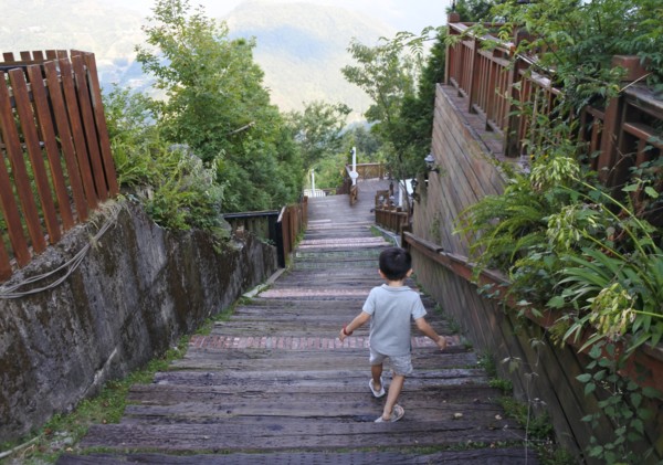一步一步走至清境山頂美好景色盡收眼底了!!沿途往下走腳步輕盈,隨時可見青山白雲、群山的美好景致連結到國民賓館,天空中的風車在清境小瑞士花園舞動飛翔,8月的清境天空非常藍!!