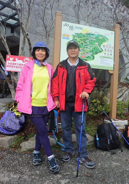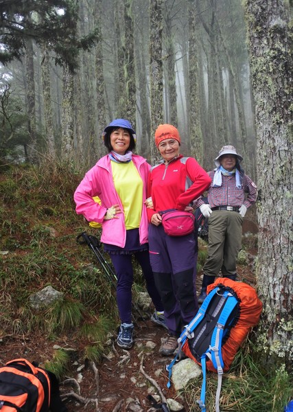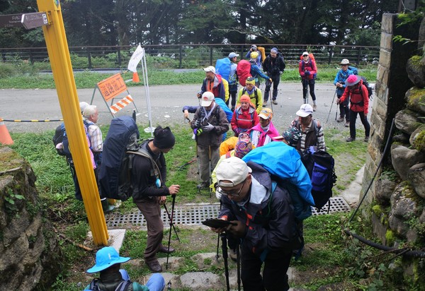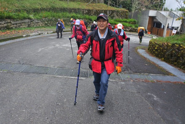 11/15 (Day1) ☀ 登山口(重裝 6公斤,2 小時,4.3 公里,上升 597 公尺)一群不老勇士,揹起背包,,拿著登山杖,脚步堅定,一步一步往上爬,開始的路會先走林道的緩坡向上,接著開始進入森林區後持續上坡,爬行復爬行,道路越走越艱險汗水流了又流全身濕透, 一路往上爬,約2880m,有點喘,調息即可恢復,但不累!