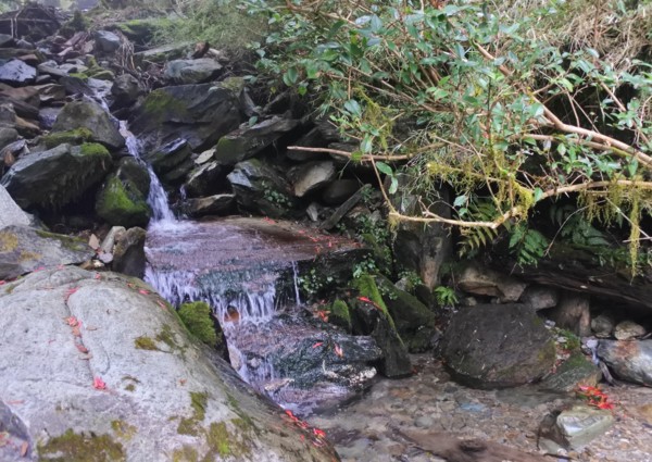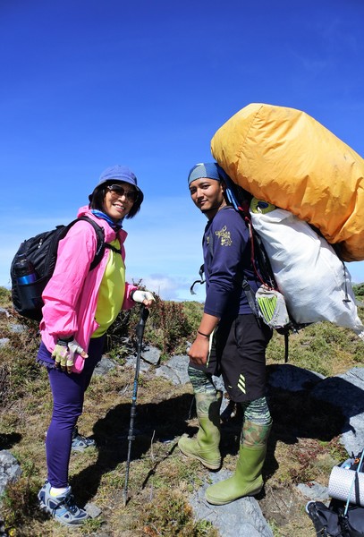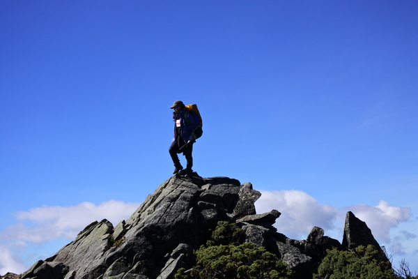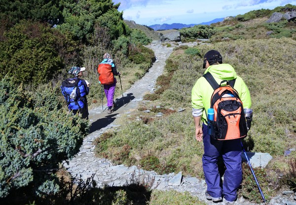 11/16 (Day2)☀7:00出發(重裝, 5 小時,5.0 公里,上升 766 公尺)走出向陽山屋,就是陡上的步道,持續在森林裡健走2.5小時,好不容易出了開闊區,陡坡仍然沒有結束,踏著大石頭向上,接著換成在有些破碎的土地上持續地陡上,短短不到2公里,就爬升了約450公尺。海拔上升使的空氣變得更稀薄,爬起來覺得更辛苦。