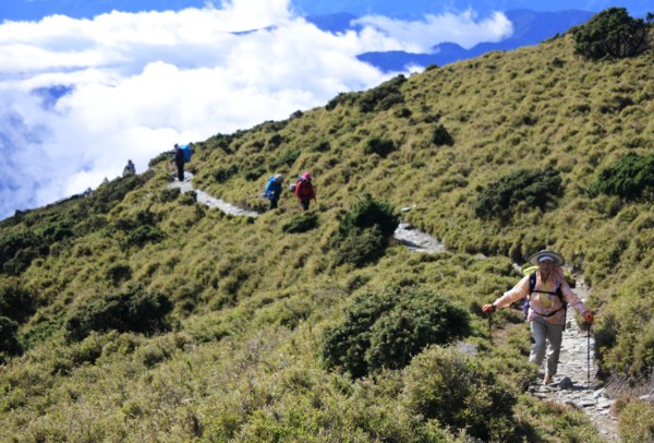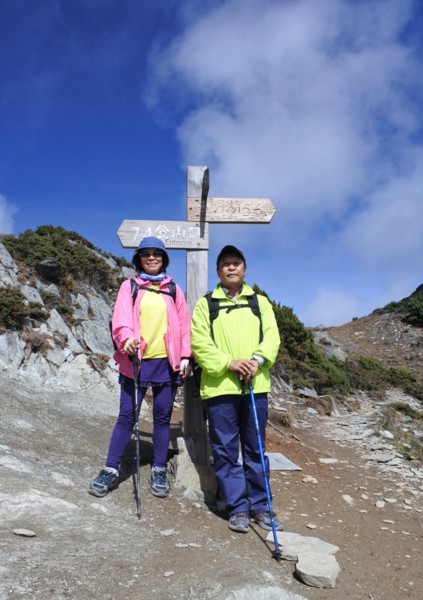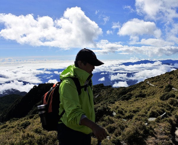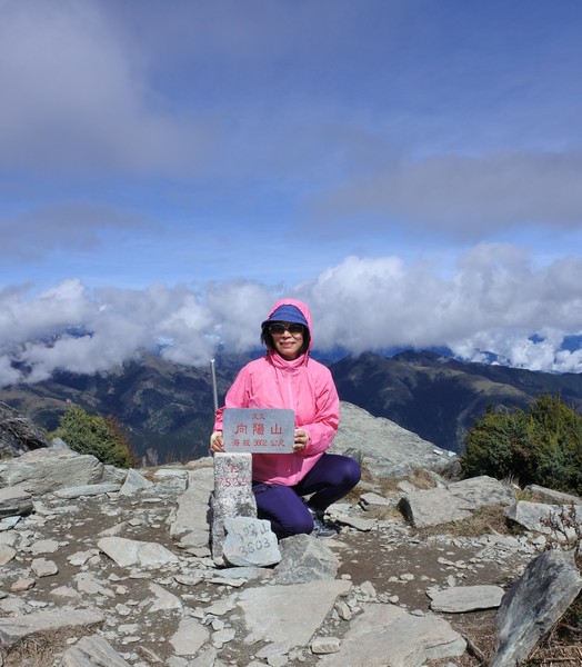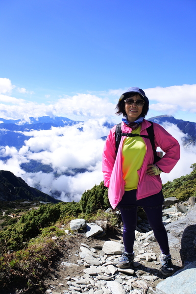 再往前走一小段,往向陽山路上有許多的亂石及冷杉林,亂石的下坡非常的難爬,登頂向陽山時,海拔3602高看群山在我們脚下 ,在陽光的照耀下天空湛藍,雲霧和成群的高山互相纏繞,四周雲海層層湧動,冷杉林蔚為一片綠色草原,攻下第一座百岳,不得不佩服自己!