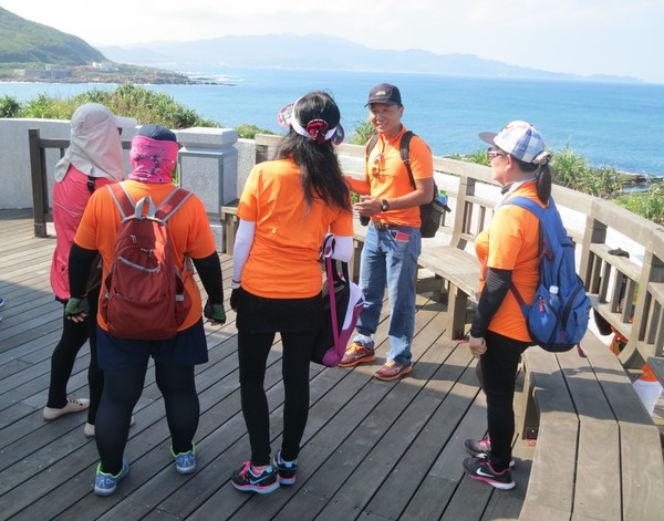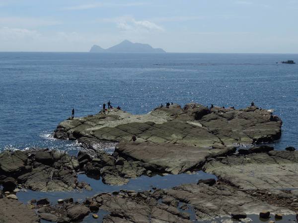 爬上「四角窟觀景台」老師講說:地形從觀景台面海下望,可看到平坦的四角窟海蝕平台,常有釣客磯釣;往前方遠眺,可見宜蘭龜山島,左方就是台灣地理極東點的三貂角燈塔。