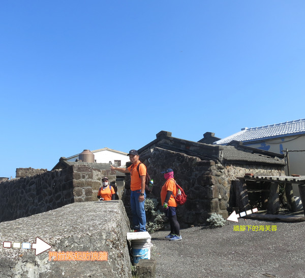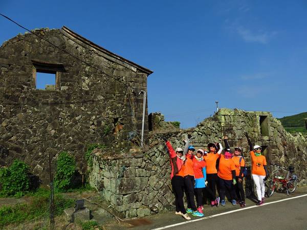 自行車道貼著海岸蜿蜒、弧線,乘騎轉進東北角海濱的馬崗漁村。老師解說:馬崗社區留存許多石頭老房,屋前大多建有二人或一人高的石牆。石牆、石材來自門前大海,地取材所建的在門前築起防浪牆