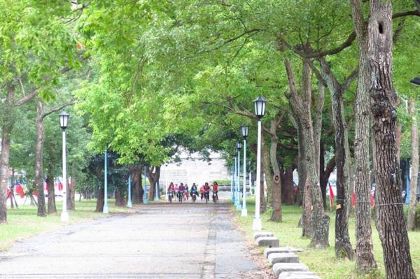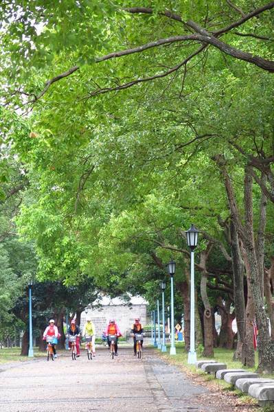 往南騎,接上愛國西路,小南門(重熙門)座落略顯嬌小的圓環裡,分隔島上的茄冬樹、樟樹搭成綠