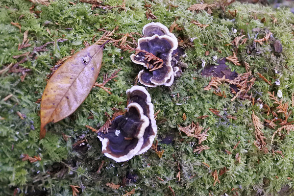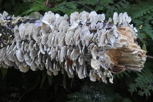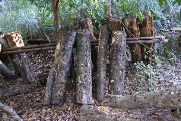 林蔭下段木香菇,段木一個洞一個洞,香菇已採收了