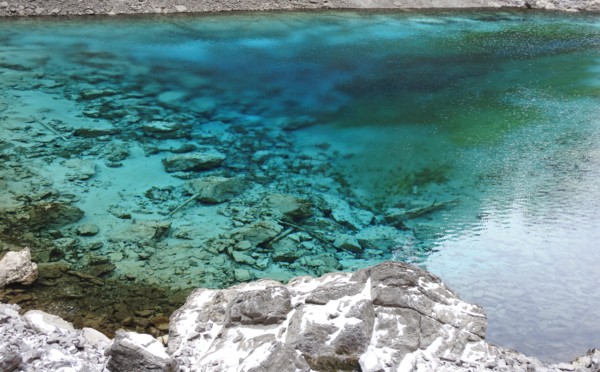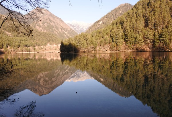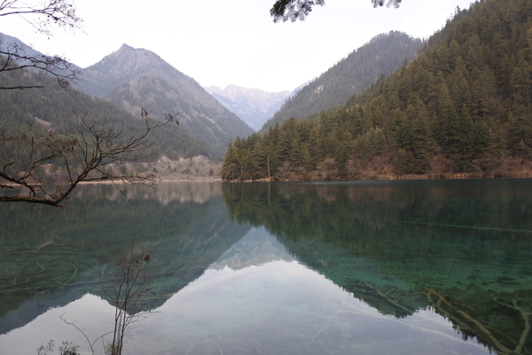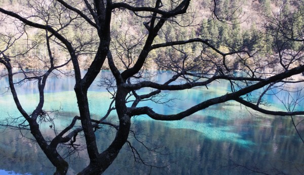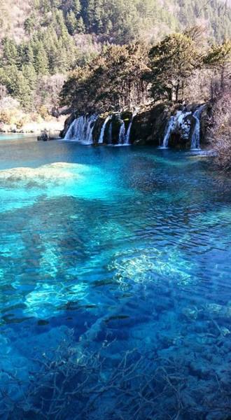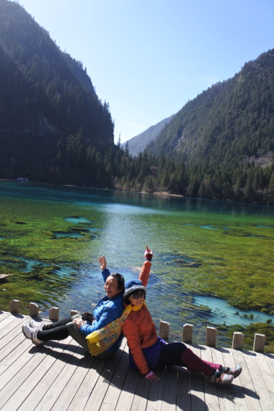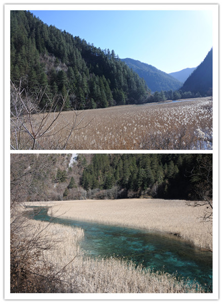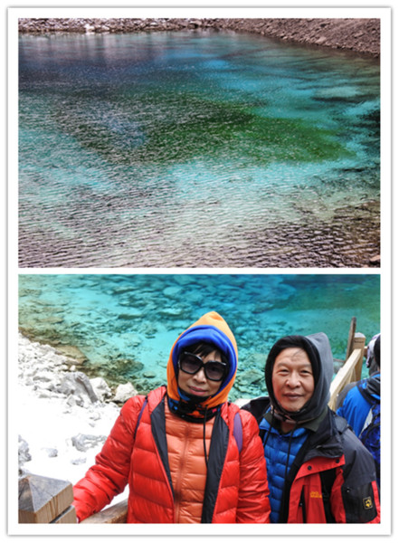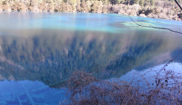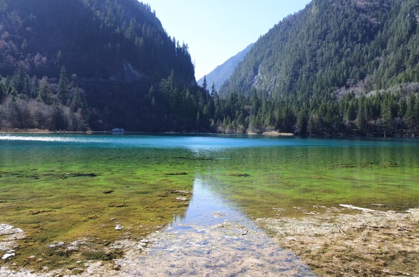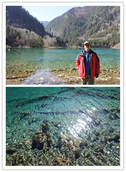 坐在溝內專用環保車,聽著車上的導覽的介紹,九寨溝的海子裡因擁有大量的碳酸鈣所以可以使雜質沉澱,使水質長年呈現透明湖水綠的色澤!