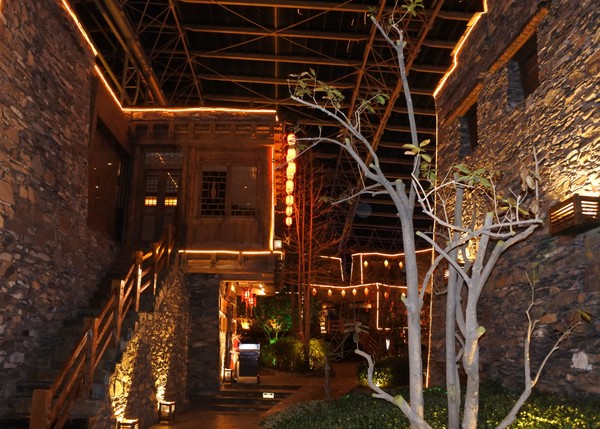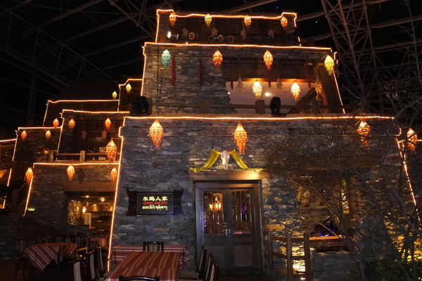 九寨天堂洲際酒店,鋼骨拱架透明玻璃中庭設計九寨古城特色的餐廳、酒吧、古羌寨與藝術 展示廳結合。 吃、住、玩、都能體驗到,川蜀動人的風情。