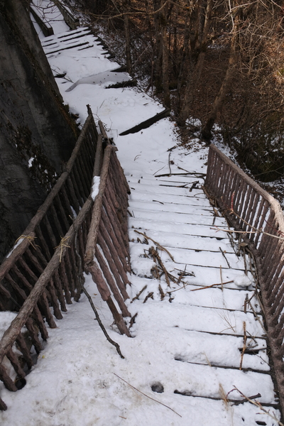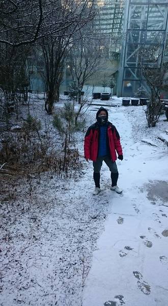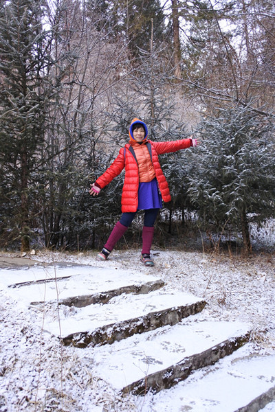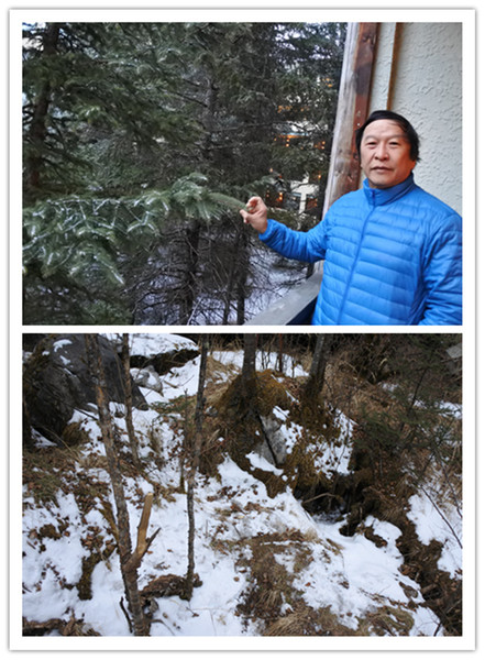 就在進溝的第2晚, 一場大雪經過一夜的急凍。一早起來打開窗戶看到玻璃和窗台一層薄霜,窗外樹枝雪白,即刻在飯店樹林間踏雪。