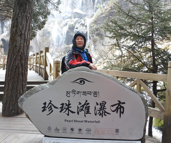 導遊帶領走訪氣勢磅礡的-珍珠灘瀑布,瀑布非常壯觀,我們慢慢健行在木棧道到珍珠灘,導遊說因為這裡地形是屬於巨大扇形鈣華流,當清澈的水流在淺黃色的鈣華灘上流動時,會激起數以萬計的水珠,當太陽光照射,就像無數珍珠一樣的啦!