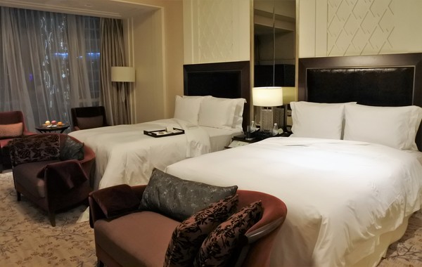夜宿成都瑞吉六星級酒店,可體驗賓至如歸的管家服務。打開房門 65平方米~~房內優雅兼具品味的時尚空間 ~~~床的對面有一台42吋大電視和大書桌