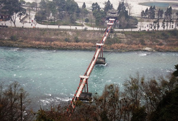 走「安瀾橋」到對岸,走在搖晃的橋上,橋身就猛烈擺動,橋是竹篾編成,橋下是岷江橫跨在內江和外江的分水處。被譽為中國古代五大橋樑,是都江堰最具特徵的景觀。