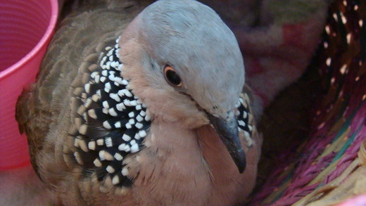 我餵牠喝了點水,還上網去查了鳥類圖鑑~是隻斑頸鳩呢!
