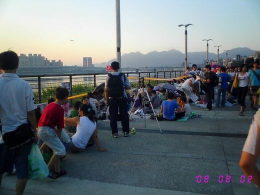 買完後一轉身,哇!那麼早來有什麼用,好位置都被佔光了,只好坐後面點,還好看報上說這次以河岸和高空煙火為主,應該還好吧,而且考慮到疏散的問題,沒有選擇坐主舞台前面的,而是比較靠近五號水門口,疏散時也較方便,坐定之後,拿出東西就大吃起來,六塊雞塊一下子就吃完了,只好呆坐在那裏聊天等時間,聊到等下要放三十分鐘,可是實際上都是在燒錢耶,現在經濟就已經不景氣了,看的時候很爽,等三十分鐘過去了,幾千萬也就這麼沒了,唉!不講這些了,還是看完再說吧。