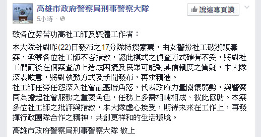 2015年9月,高雄市刑警大隊召開記者會,說明逮到樹頭的一對毒販,其中關鍵是新來女巡官和分隊長兩人假扮社工,騙取嫌犯開門應答,避免了他們緊急湮滅事證(事後刑警大隊澄清時表示,他們是有搜索票的)。