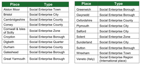 2014年在Alston Moor成為第一個獲獎的「社會企業村」之後,英國社會企業總會(SEUK)進一步推動了「社會企業所在地」的計畫。SEUK透過各種方式補助正在發展在地社會企業的地區,提供資源、諮詢、網絡、支持等各項服務。