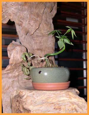 為了讓我在三義買的風化木擺設架有個視覺焦點,我精挑細選在三個月前買了個小盆栽,種植的是可愛的馬拉巴栗,那是一種很好養很耐陰的植物,兩株環繞而上頗富詩意。