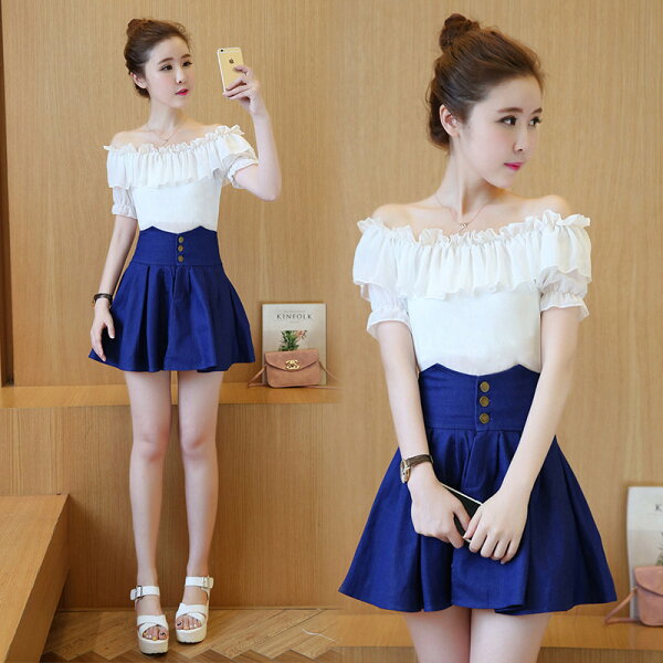 出自:線上購物分享 - FINDSENSE G5 韓國時尚 一字肩 雪紡 上衣 高腰 牛仔短裙 套裝 漏肩 連身裙