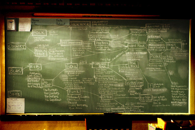 《搖滾教室》當中最吸引人之處不只是其中收錄的歌曲,另外代課老師杜威在黑板上畫出搖滾年樹介紹各種音樂風格或重量級樂團,和播放各超級樂團的演唱會影片時,再再牽動所有搖滾樂迷的心,因為他敘述這些樂團的過往也都是所有搖滾樂迷不可缺少的搖滾回憶。連他在下課之後每人發送搖滾CD回家作業裏都可以看出用心程度,在這些作業當中就包括了給鍵盤手勞倫斯的Yes樂團1971年經典專輯【Fragile】、鼓手佛瑞迪(Freddy Jones)的Rush樂團1976年經典專輯【2112】、金髮合聲天使馬塔的金髮美女合唱團(Blondie)1978年經典專輯【Parallel Lines】、後來加入的女合聲塔米卡(Tomika)的平克佛洛伊德樂團(Pink Floyd)1973年經典專輯【The Dark Side of the Moon】和吉他手柴克的吉米漢醉克斯(Jimi Hendrix)的專輯等。值得一提的是,原本分配到搬運器材的塔米卡要求加入合聲之際,她隨口試唱了一段歌曲則是艾瑞莎富蘭克林(Aretha Fraklin)1967年節奏藍調(R&B)排行榜冠軍的單曲【Chain of Fools】。