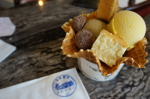 日出鳳梨酥、巧克力球、乳酪蛋糕裝點在冰淇淋的旁邊,