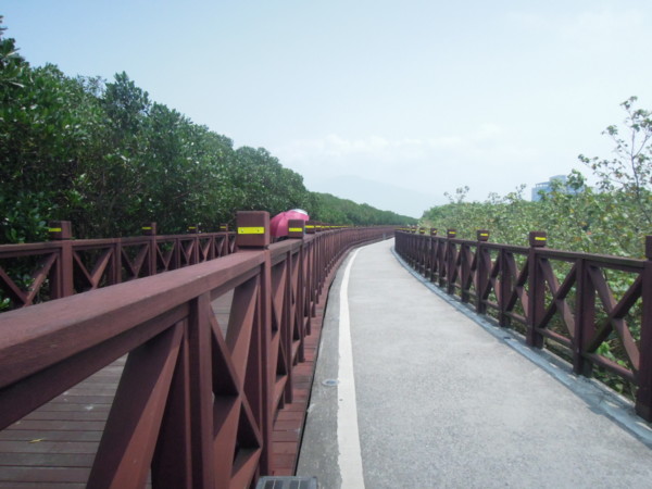 租好自行車後,小編沿著八里左岸自行車道往十三行博物館的方向騎,這條自行車道是從觀音坑溪口起,一直到八仙海岸,全程約15公里,地面平整,木棧道與水泥路面交錯設置。
