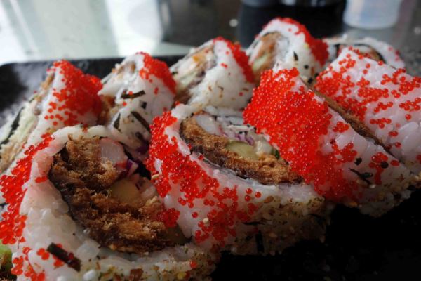 我們點了店內的超級招牌料理-飛魚卵壽司,鮮豔的飛魚卵包裹著醋飯的外圍,