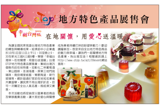 為讓全國民眾見證台灣地方特色產業的轉型與輔導成果,經濟部中小企業處於10月1日至11日在新光三越A11館6樓,舉辦「幸福台灣味~在地關懷‧用愛心送溫暖」 台灣OTOP地方特色產品展售會,集結台灣25個縣市的在地特產,如彰化二林葡萄酒、東山咖啡、澎湖海產、屏東三地門琉璃珠、南投埔里紙藝、鶯歌陶瓷、新竹玻璃等,總計超過87家的在地知名業者共襄盛舉,讓民眾不用台灣趴趴走,即可一次購足全台人氣名產,既經濟又實惠。