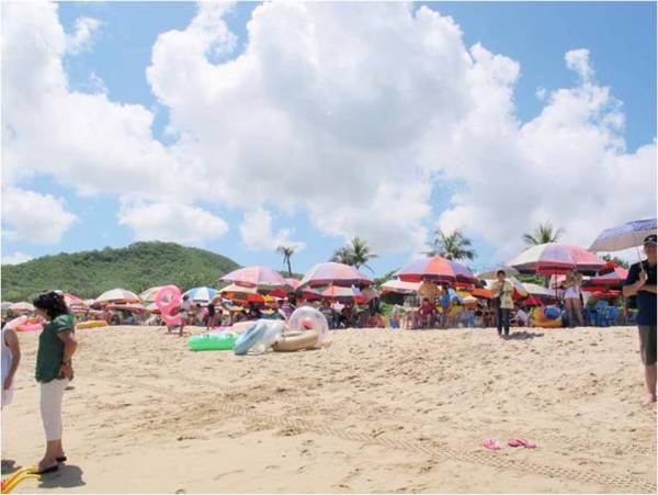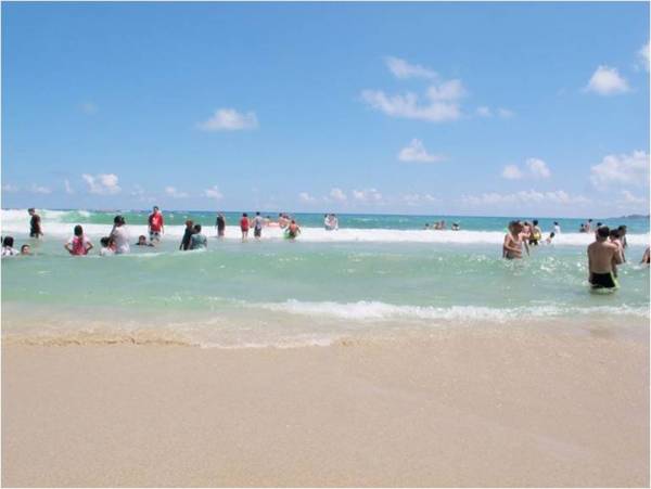 頂著大太陽,一群人換完泳裝衝向南灣,迫不及待想擁抱那清澈的海水!看看那湛藍的天空,刺眼的太陽光,大家都不畏曬黑的風險往海邊衝。我還看見有人被埋在沙堆裡曬日光浴,還有人被丟進海裡兩三次,那個畫面有趣極了!