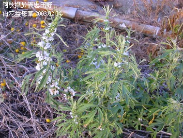 Leucas mollissima Wall. var. chinensis Benth.‧科 名: 唇形花科(Lamiaceae)白花草屬(Leucas) ‧別 名: 白花仔草、金錢薄荷、春草、鼠尾癀、鼠尾草、虎咬癀、小抹草、小魚針草、小本霍香、濱海白絨草 ‧原產地: 中國大陸、東南亞、印度等地 ‧分布: 台灣大部分地方、中低海拔灌叢、草地、路旁及海濱。 ‧用 途: 2.藥用:性味:全草:甘、微辛、平。效用:全草:清肺止咳,清熱解毒,補腎,消炎。治腸炎,盲腸炎,子宮炎,疔瘡,腫毒,肺熱咳嗽,咯血,胸痛。腎虛,陽萎,遺精,腸炎,闌尾炎,子宮炎,乳腺炎,癤腫,骨折,毒蛇咬傷。 ‧莖: 高約 30~60 公分,被白色細毛,莖基部伏臥,多分枝。 ‧葉: 葉對生,卵形,粗鋸齒緣,葉片長 1~3 公分,寬 0.5~2.5 公分 ,基部鈍形至楔形,先端鈍形,兩面被白色伏生絹狀毛;葉柄長 0.5~2 公分。 ‧花: 花冠白色,輪生聚繖花序,密生於葉腋,花萼筒狀,10 齒裂,裂片狹三角形,花冠筒狀,2唇裂,上唇直立,微凹,下唇3裂。花期 3~10 月。堅果三稜形,平滑,結果期 4~11 月。 ‧果: 堅果近三稜形,兩邊夾角 900,第三邊圓弧形,長約 0.18 公分,寬約 0.08 公分,尾部尖,基部斜屑,褐色,粗糙,有光澤,結果期 4~11 月。 ‧特徵: 多年生草本,高約 30~60 公分,被白色細毛,莖基部伏臥,多分枝。葉對生,卵形,粗鋸齒緣,葉片長 1~3 公分,寬 0.5~2.5 公分 ,基部鈍形至楔形,先端鈍形,兩面被白色伏生絹狀毛;葉柄長 0.5~2 公分。花冠白色,輪生聚繖花序,密生於葉腋,花萼筒狀,10 齒裂,裂片狹三角形,花冠筒狀,2唇裂,上唇直立,微凹,下唇3裂。花期 3~10 月。堅果近三稜形,兩邊夾角 900,第三邊圓弧形,長約 0.18 公分,寬約 0.08 公分,尾部尖,基部斜屑,褐色,粗糙,有光澤,結果期 4~11 月。分布於平地至中海拔山區,生長在路旁、荒地草叢或海邊岩石地。 ‧其他: 更多資料:臺灣藥用植物資源名錄 行政院衛生署中醫藥委員會 編 白花草 92年10月394頁