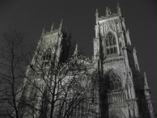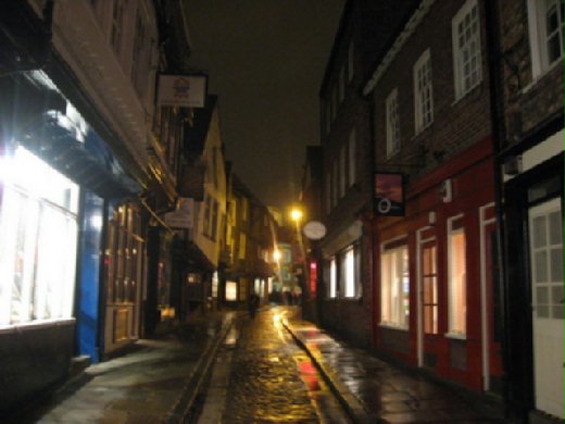 把話題拉回來一下,反正即然沒有機會來一趟著名的鬼屋之旅,那就自行夜遊了。除了最高點的約克大教堂是必遊之處外,第一站當然是古市集的街道Shambles.這條約克最古老的街道仍保有以前肉舖的傳統-小格子鐵窗欄。小街中心有一間聖殿,據稱是天主教受難者瑪格麗特的家,她在16世紀時,因在家中做天主教的彌撒而被判以重石壓死。加上以前屠宰場也在此,所以此巷的夜晚有詭譎的寧靜感,偶爾一群獵鬼團體經過才會打破此寧靜感。