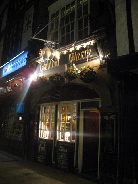 走出Shambles逛到大街,瞄到一間陰森林的小店,外頭掛著一隻金羊,在夜色中透露出一股陰森氣息。走近一看,招牌上竟然寫著,歡迎到約克鬧鬼最兇的旅館。由外往內望,一樓是酒吧,跟街上其他擠滿人的酒吧相比,只有兩人在此小酌。室內的燈光相當的暗。外頭招牌寫著:「本建築屋沒有地基,因此樓梯才會搖搖晃晃,而最著名的鬼是以前一位鎮長夫人,經常在此出入」。小旅館只有四間房,住宿費每人40英鎊,其中兩房是四柱大床。邀請所有膽大的觀光客留宿。