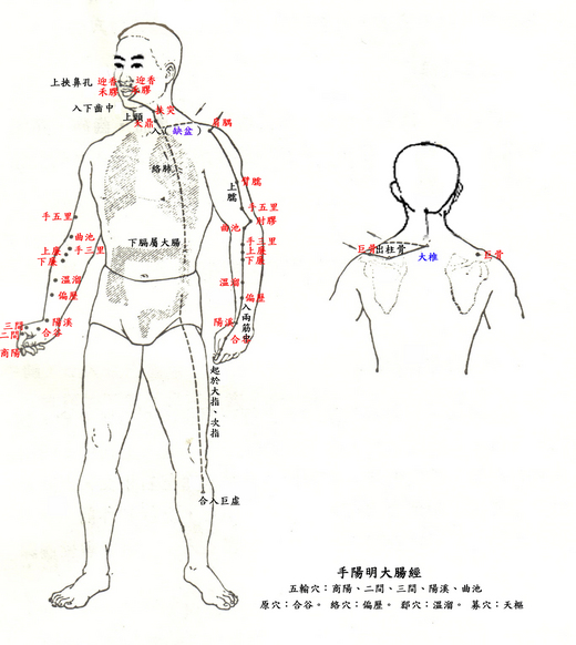 本經穴位 商陽、二間、三間、合谷、陽溪、偏歷、溫溜、下廉、上廉、手三里、曲池、肘膠、手五里、臂孺、肩髃、巨骨、天鼎、扶突、禾膠、迎香。共二十穴。