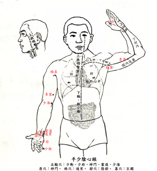 《靈樞‧經脈》:“心手少陰之脈:起於心中,出屬心系,下膈,絡小腸。其支者,心系上挾咽,繫目系。其直者,復從心系卻上肺,下出腋下,循孺內後廉,行手太陰、心主之後,下肘內,循臂內後廉,抵掌後銳骨之端,入掌內後廉,循小指之內出其端。”