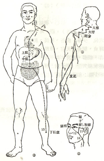 《靈樞‧經脈》:“小腸手太陽之脈:起於小指之端,循手外側,上腕,出踝中,直上循臂骨下廉,出肘內側兩骨之間,上循臑外後廉,出肩解,繞肩胛,交肩上,入缺盆,絡心;循咽下膈,抵胃,屬小腸。其支者,從缺盆循頸,上頰,目銳眦,卻入耳中。其支者,別頰上顴,抵鼻,至目內眦。”《靈樞‧邪氣臟腑病形》:“小腸合入於亙虛下廉。”