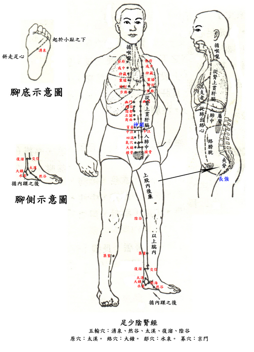 《靈樞‧經脈》:“腎足少陰之脈:起於下,斜走足心,出於然谷之下,循內踝之後,別入跟中,以上踹內,出膕內廉,上股內後廉,貫脊,屬腎,絡膀胱。其直者,從腎上貫肝膈,入肺中,循喉嚨,挾舌本。其支者,從肺出絡心,注胸中。”