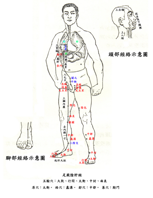 《靈樞‧經脈》:“肝足厥陰之脈:起於大趾叢毛之際,上循足跗上廉,去內踝一寸,上踝八寸,交出太陰之後,上膕內廉,循股陰,入毛中,環陰器,抵小腹,挾胃,屬肝,絡膽,上貫膈,布脇肋,循喉嚨之後,上入頏顙,連目系,上出額,與督脈會於顛。其支者,從目系下頰裏,環唇內。其支者,復從肝別,貫膈,上注肺。”