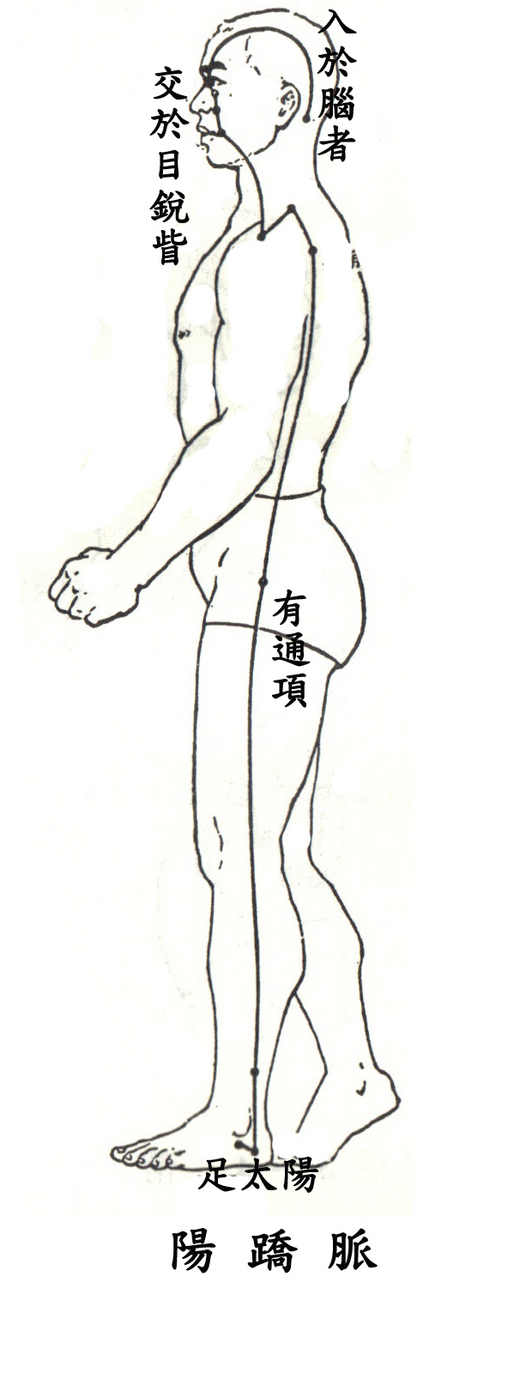 足 太 陽 有 通 項 入 於 腦 者 , 正 屬 目 本 , 名 曰 眼 系 。 頭 目 苦痛 , 取 之 在 項 中 兩 筋 間 。 入 腦 乃 別 陰 蹻 、 陽 蹻 , 陰 陽 相交 , 陽 入 陰 , 陰 出 陽 , 交 於 目 銳 眥 。