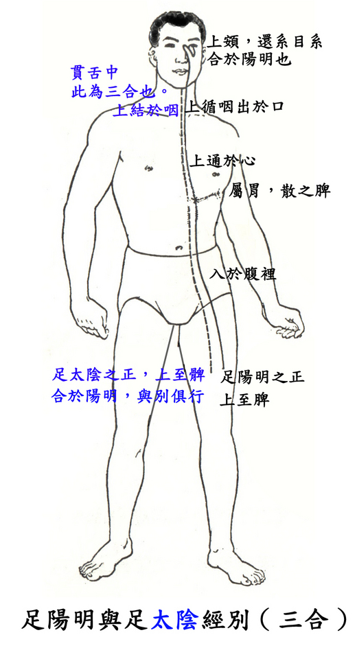 足陽明之正,上至脾,入於腹裡,屬胃,散之脾,上通於心,上循咽出於口,上頞,還系目系,合於陽明也。足太陰之正,上至髀,合於陽明,與別俱行,上結於咽,貫舌中。此為三合也。