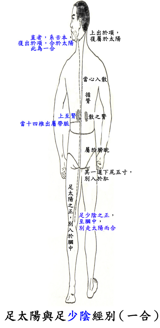 足太陽之正,別入於膕中,其一道下尻五寸,別入於肛,屬於膀眈,散之腎,循膂當心入散;直者,從膂上出於項,復屬於太陽,此為一經也,足少陰之正,至膕中,別走太陽而合,上至腎,當十四椎出屬帶脈;直者,系舌本,復出於項,合於太陽。此為一合。成以諸陰之別,皆為正也。