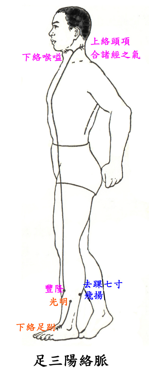 足 陽 明 之 別 , 名 曰 豐 隆 。 去 踝 八 寸 。 別 走 太 陰 ;其 別 者 , 循 脛 骨 外 廉 , 上 絡 頭 項 , 合 諸 經 之 氣 , 下 絡 喉 嗌 。 其 病 氣 逆 則 喉 痹 瘁 瘖 。 實 則 狂 巔 , 虛 則 足 不 收 , 脛 枯 。 取 之 所 別 也 。