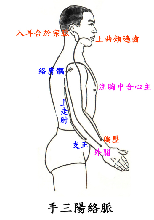 手 少 陽 之 別 , 名 曰 外 關 。 去 腕 二 寸 , 外 繞 臂 , 注胸 中 , 合 心 主 。 病 實 則 肘 攣 , 虛 則 不 收 。 取 之 所 別 也 。