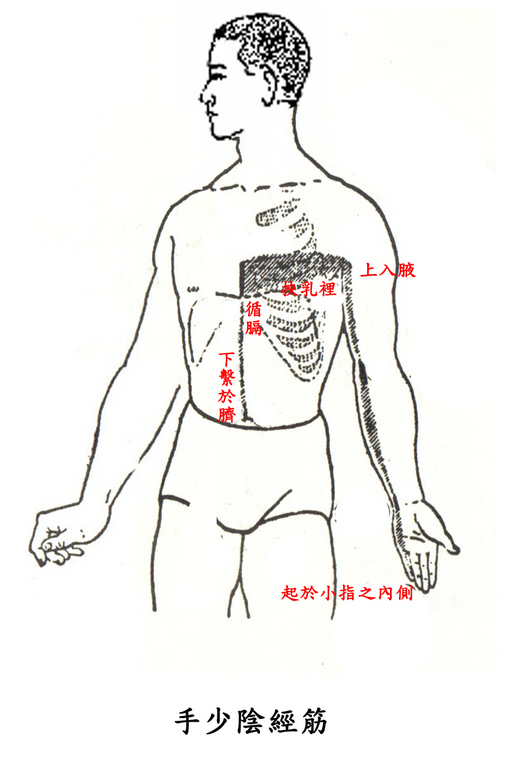 手少陰之筋,起於小指之內側,結於銳骨,上結肘內廉,上入腋,交太陰,挾乳裡,結於胸中,循膈,下繫於臍。