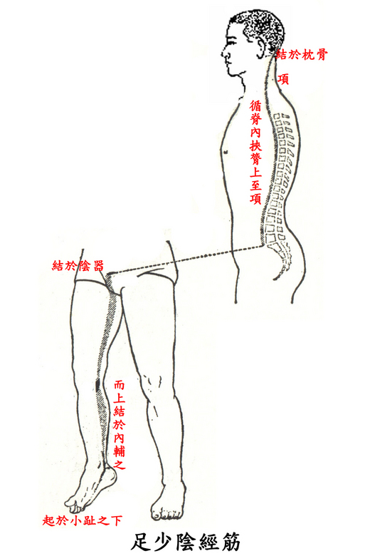 足少陰之筋,起於小趾之下,並足太陰之筋,斜走內踝之下,結於踵,與太陽之筋合,而上結於內輔之下,並太陰之筋而上循陰股,結於陰器,循脊內挾膂上至項,結於枕骨,與足太陽之筋合。