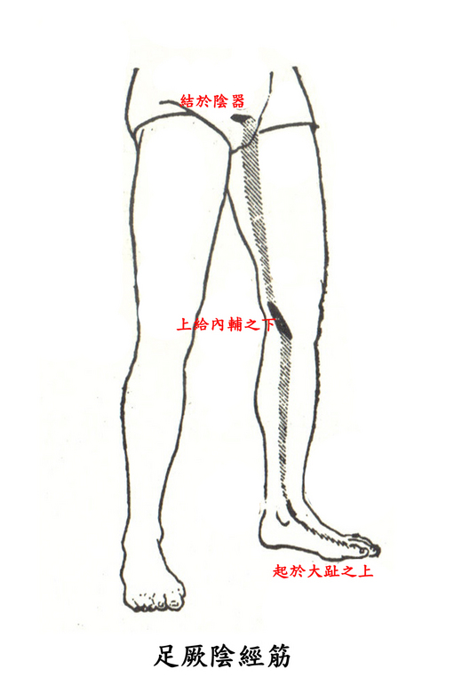 足厥陰之筋,起於大趾之上,上結於內踝之前,上循脛,上給內輔之下,上循陰股,結於陰器,絡諸筋。