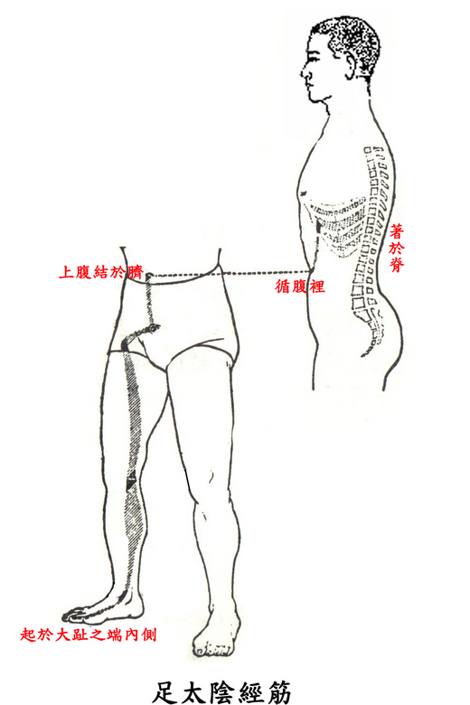 足太陰之筋,起於大趾之端內側,上結於內踝;其直者,絡於膝內輔骨,上循陰股,結於髀,聚於陰器,上腹結於臍,循腹裡,結於肋,散於胸中;其內者,著於脊。