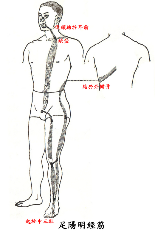 足陽明之筋,起於中三趾,結於跗上,斜外上加於輔骨,上結於膝外廉,直上結於髀樞,上循脅,屬脊;其直者,上循脛,結於膝;其支者,結於外輔骨,合少陽;其直者,上循伏兔,上結於髀,聚於陰器,上腹而布,至缺盆而結,上頸,上挾口,合於頄,下結於鼻,上合於太陽,太陽為目上網,陽明為目下網;其支者,從頰結於耳前。