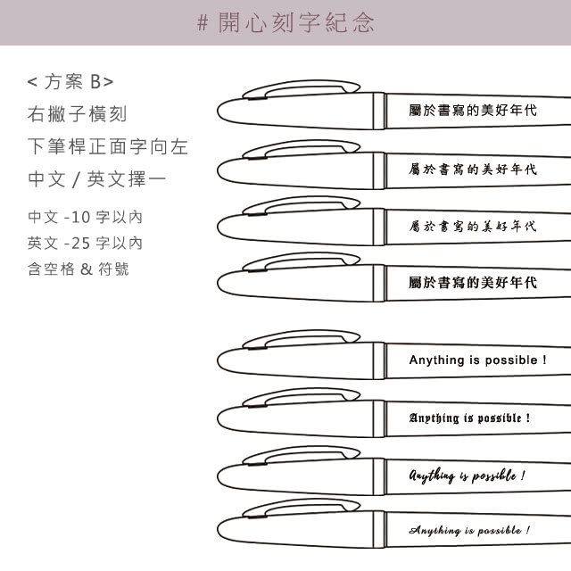 B.右撇子橫刻方案|下筆桿正面字向左|英文或中文擇1