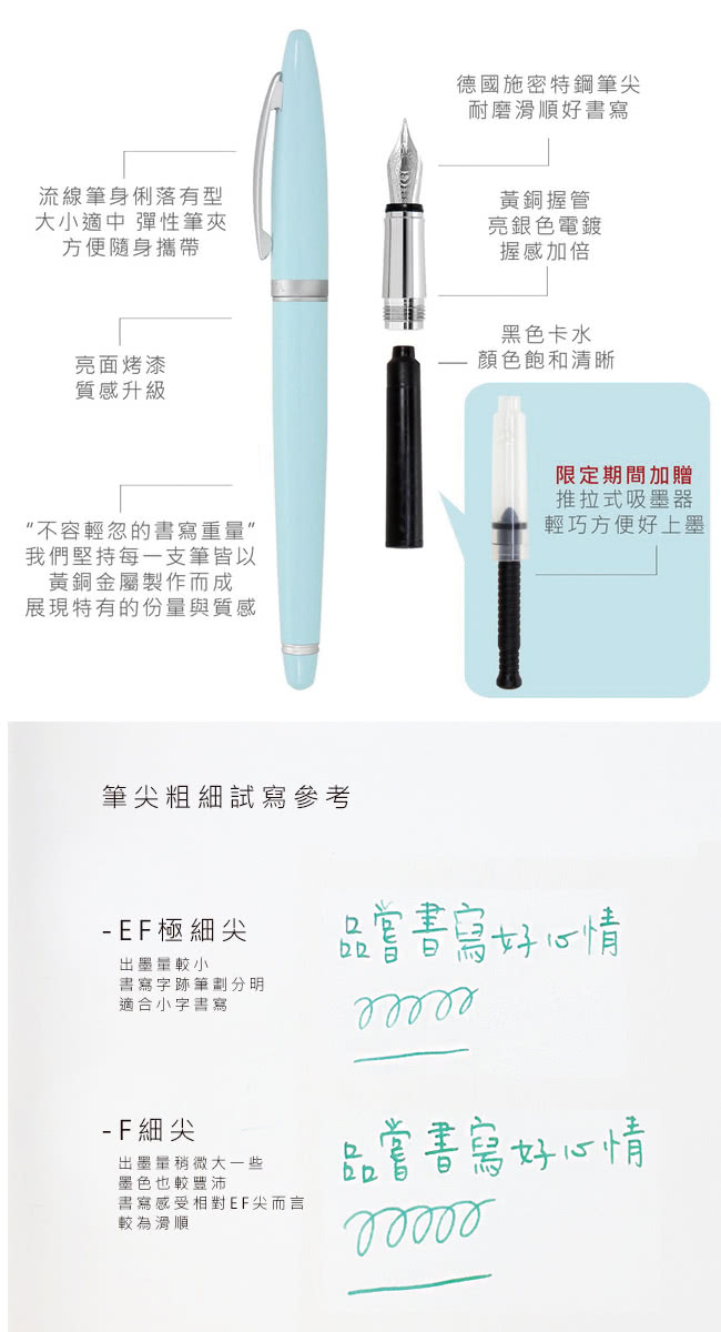 【保養說明】鋼筆如久未使用有可能導致墨水乾涸,建議定期以水清潔鋼筆尖以延長筆尖使用壽命;