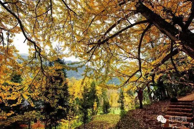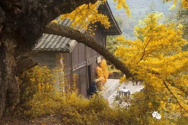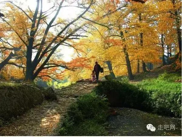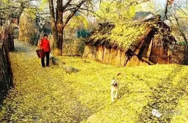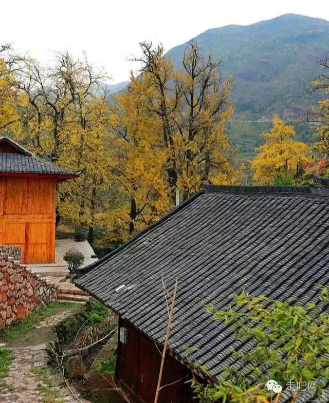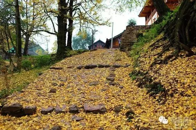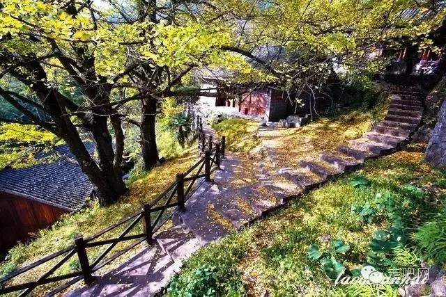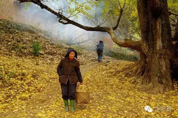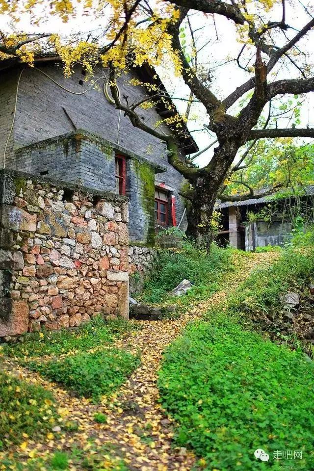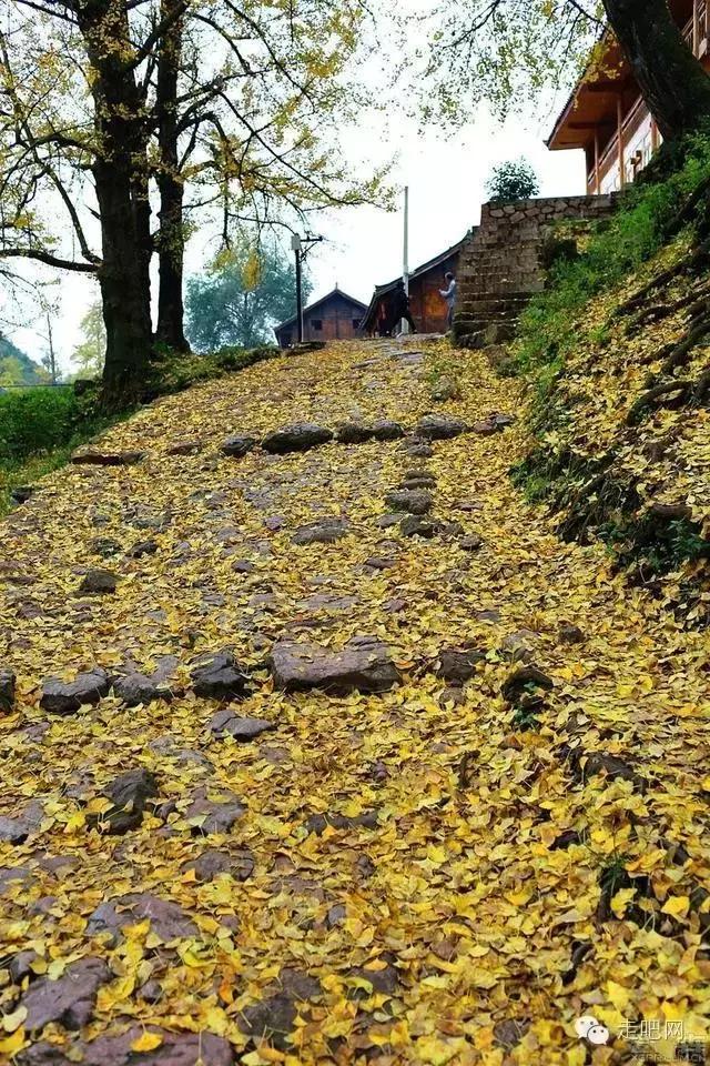 金色的秋葉給它鍍了一層夢幻的色彩,進入深秋後夏日里層層疊疊的綠葉全部變成了金黃色,落葉鋪滿了石板小徑、黑瓦的房屋、收穫後的稻田;