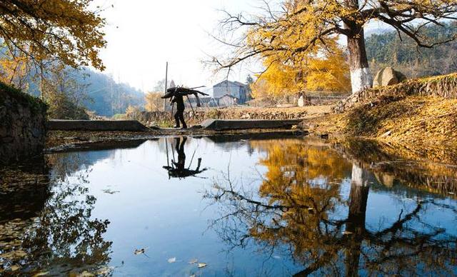 就連村中清澈透明的小溪、溪上的小石橋,也被扇形的銀杏葉裝點成了金色,