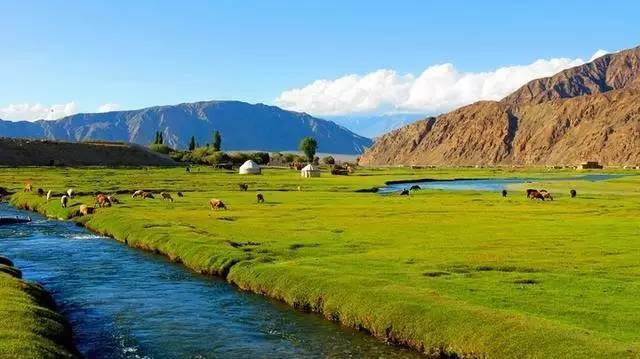 阿拉爾金草灘位於塔什庫爾幹縣城東側,塔什庫爾乾河兩岸,是帕米爾高原上的一片濕地。這里水草豐美,牛羊遍地。