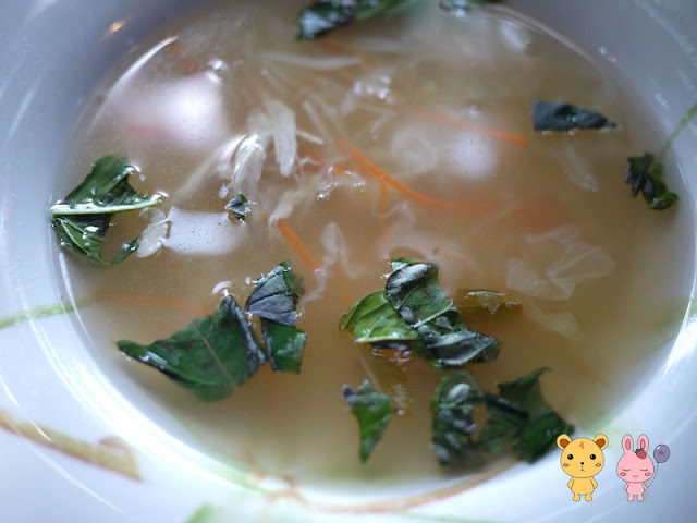 一開始的是湯品,每天都有兩種不同的湯可以選,兔兒點的是濃湯,他們的濃湯雖然不是很濃稠的那種,但還是非常的有味道,裡面也頗多料的,熊點的則是羅勒雞肉蔬菜清湯,清湯的味道蠻爽口的,但如果又喝了濃湯後,熊只能說!建議大家點濃湯吧~XD。
